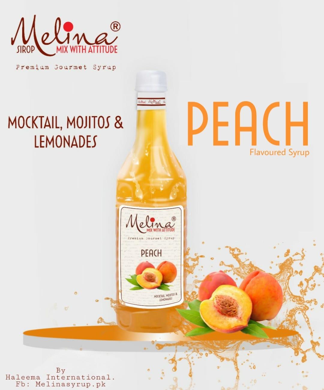 \nMelina - Peach Flavored Syrup Versatile flavor, with fresh & Aromatic.Great for Mocktails, Cocktails, Margaritas, Sodas & Mojitos. Our Peach flavored Syrup will make your drinks flavorful & perfectly sweetened. Alluring people with its scent while enticing with it’s rich flavor is what makes Peach flavored Syrup so delectable.
